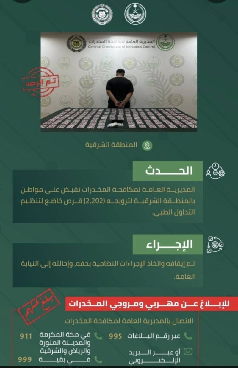 زهير الغزال - الدمام تاريخ النشر: 20 فبراير 2026 16:45 KSA قبضت مكافحة المخدرات على مواطن بالمنطقة الشرقية لترويجه أقراصًا خاضعة لتنظيم التداول الطبي.