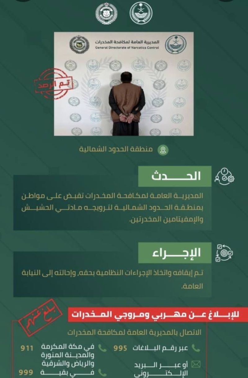 زهير الغزال - الحدود الشمالية تاريخ النشر: 20 فبراير 2026 16:50 KSA قبضت مكافحة المخدرات على مواطن بمنطقة الحدود الشمالية لترويجه مادتي الحشيش والإمفيتامين المخدرتين.
