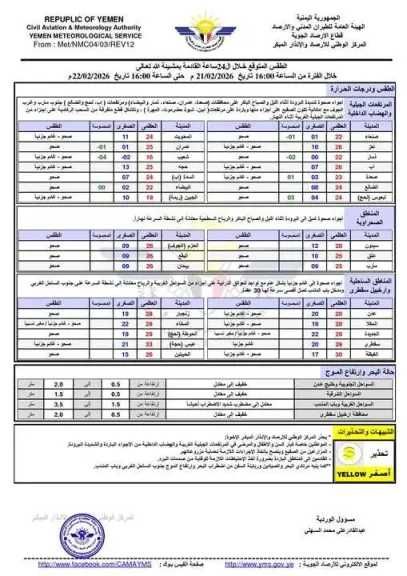 على الصعيد الآخر، أوضح التقرير أن المناطق الساحلية ستشهد أجواءً صحوة إلى غائمة جزئياً، تزامناً مع وجود عوالق ترابية، ورياح معتدلة إلى نشطة يُتوقع أن تصل سرعتها إلى 30 عقدة، وستتركز هذه الرياح جنوب الساحل الغربي وعند مدخل باب المندب، وهو ما يستوجب حذراً من الملاحين وصيادي الأسماك.