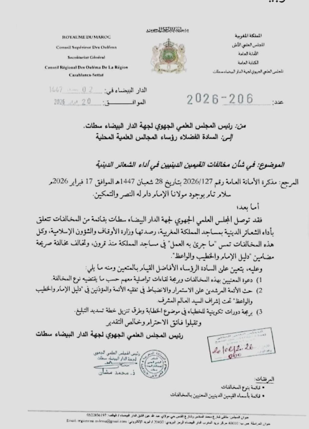 أفادت وثيقة صادرة عن المجلس العلمي الجهوي لجهة الدار البيضاء- سطات برصد عدد من المخالفات المنسوبة إلى بعض القيمين الدينيين بالجهة، وذلك استنادا إلى تقارير رفعتها وزارة الأوقاف والشؤون الإسلامية.