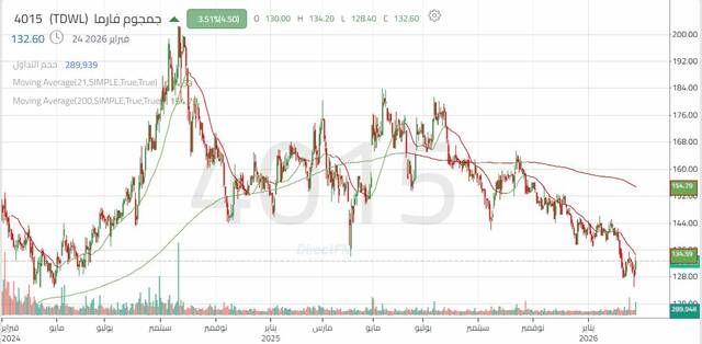 ويأتي ذلك بالتزامن مع التداول دون المتوسط المتحرك الرئيسي، ما يشير إلى ضعف الاتجاه على المدى المتوسط. ونجح السعر في الحفاظ مستوى دعم هام عند 127.70 ريال.