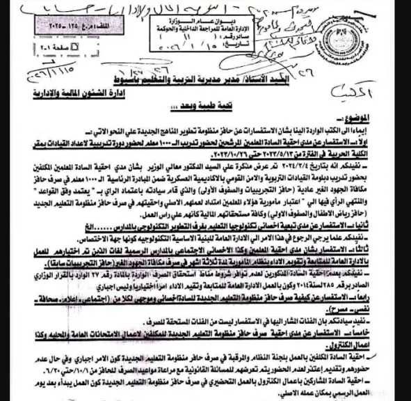 أرسلت وزارة التربية والتعليم خطابًا رسميًا للمديريات التعليمية لتوضيح أحقية المعلمين المرشحين لحضور تدريب الـ1000 معلم في الحصول على حافز منظومة تطوير المناهج الجديدة، وحافز الصفوف الأولى وحافز الجهود غير العادية. وأكدت الوزارة أن فترة التدريب تعتبر مأمورية رسمية ممتدة من عمل المعلمين الأصلي، ما يضمن حصولهم على كافة مستحقاتهم المالية كما لو كانوا على رأس العمل، سواء في التدريب أو خلال دبلومة القيادات التربوية والأمن القومي بالأكاديمية العسكرية ضمن المبادرة الرئاسية.