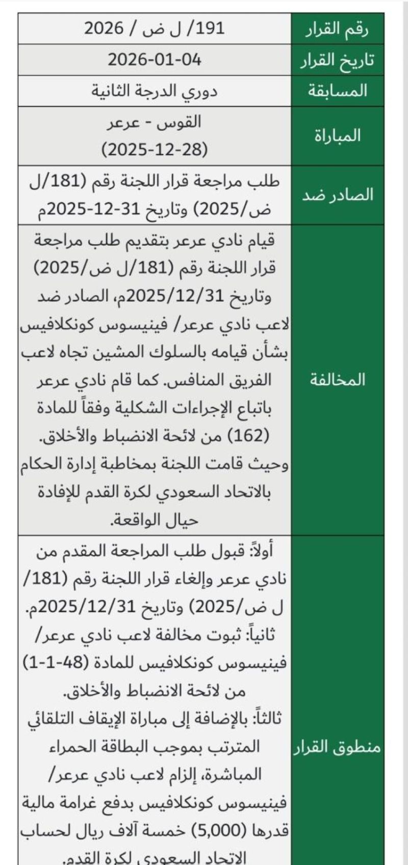 أولاً: قبول طلب المراجعة المقدم من نادي عرعر وإلغاء قرار اللجنة رقم (181/ل ض/2025) وتاريخ 2025/12/31م.ثانياً: ثبوت مخالفة لاعب نادي عرعر فينيسوس كونكلافيس للمادة (48-1-1) من لائحة الانضباط والأخلاق.