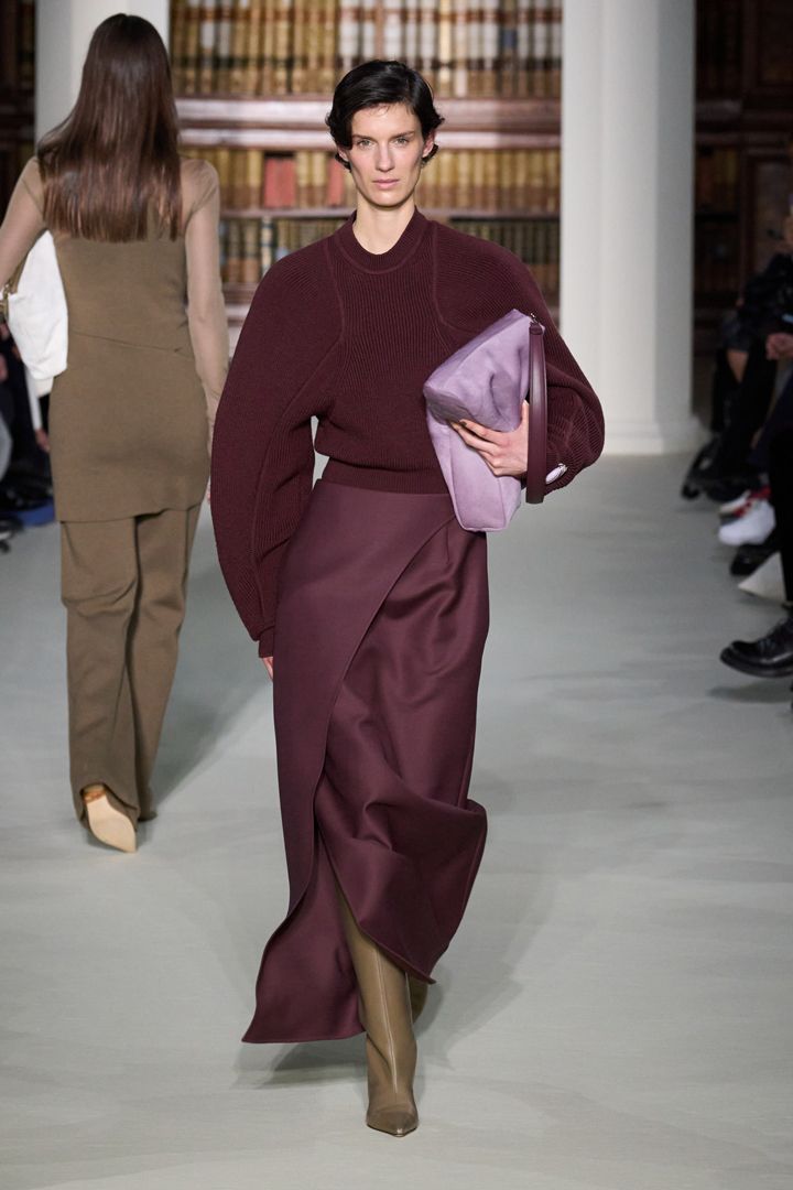 بمتابعة عروض الأزياء العالمية وحسابات مدونات الموضة على إنستغرام، ستلاحظين الحضور الطاغي للون البرغندي، ما يعني أنه سيكون نجم الشتاء المقبل، اللون المفضل لصاحبات الذوق الرفيع، قدمته ماركة جيادا Giada ضمن أحدث مجموعاتها، فظهرت إحدى العارضات مرتديه كنزة برغندية قصيرة بياقة مرتفعة وأكمام منفوخة منسقة مع تنورة Wrap طويلة من نفس لونها، وقد أحببنا تنسيقها مع البوت الطويل الأخضر الكاكي والحقيبة الأرجوانية الفاتحة، ستبدو أقراطك الناعمة المصممة من الذهب الأبيض رائعة على هذه الطلة.