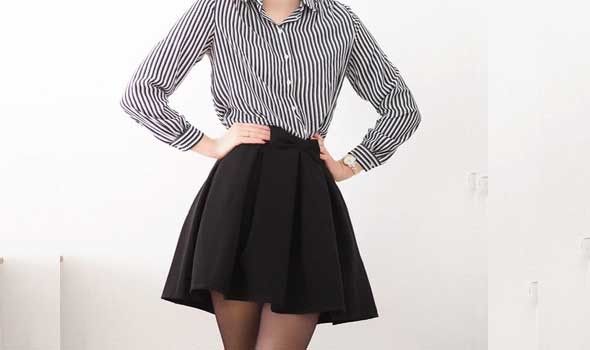 التنورة: اختاري تنورة ذات ثنيات بلون محايد مثل الأسود، البيج، أو الكحلي.